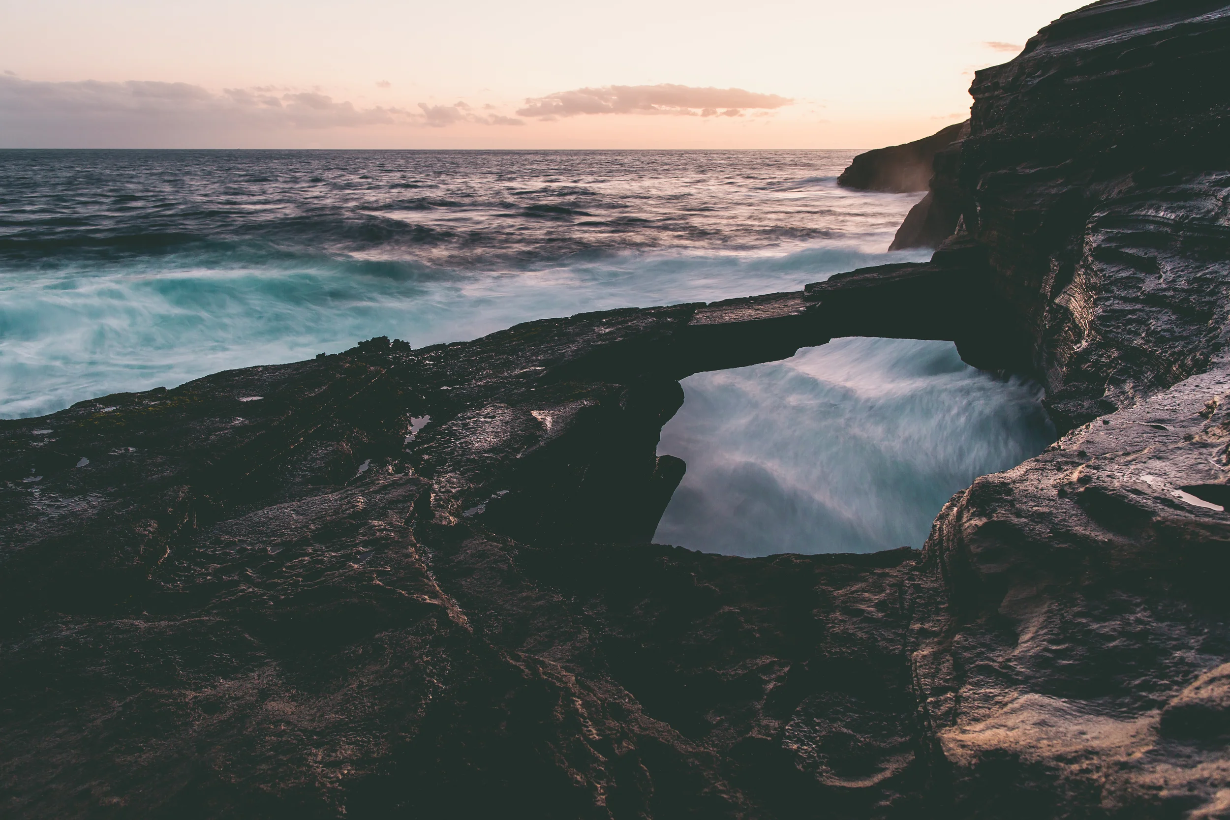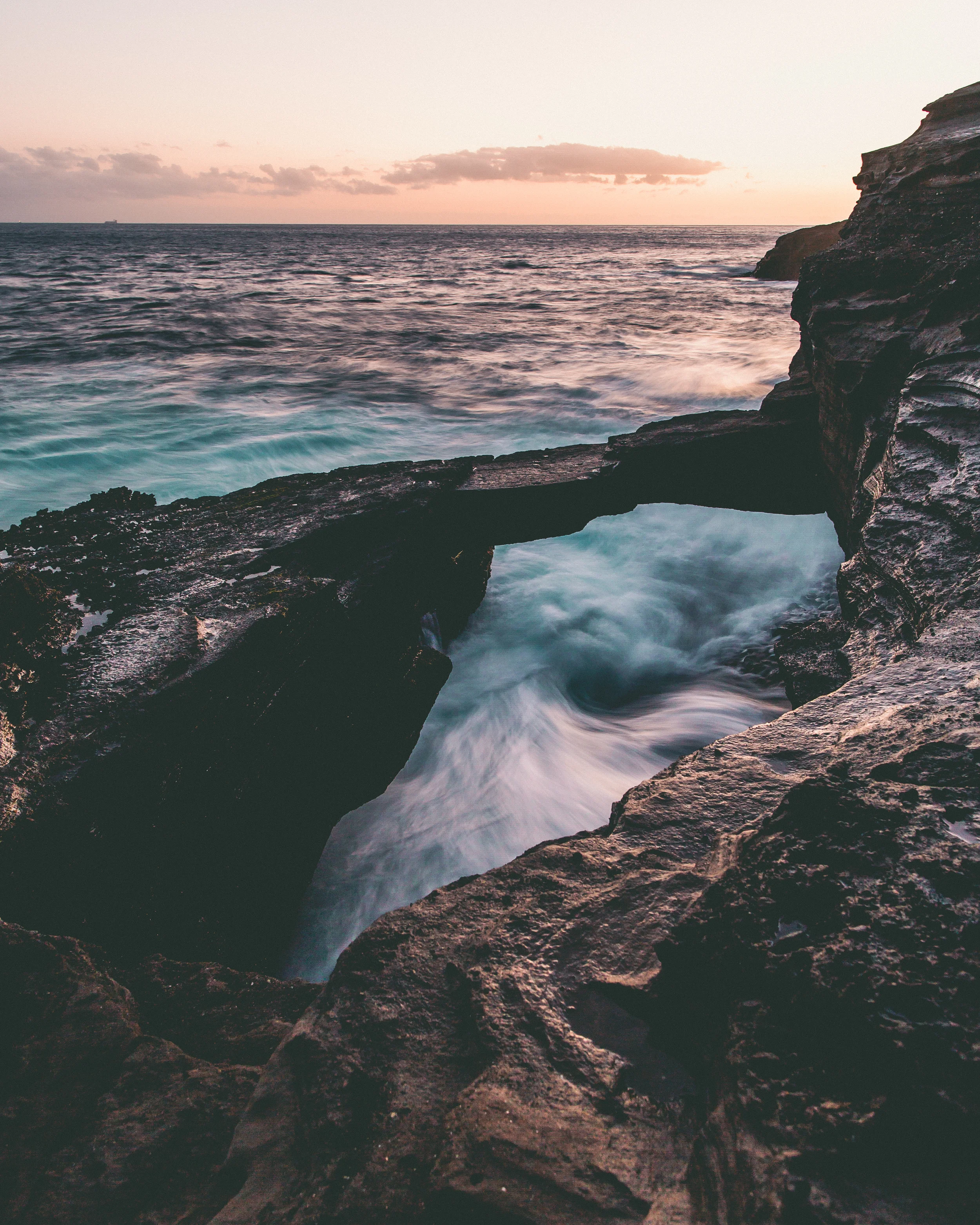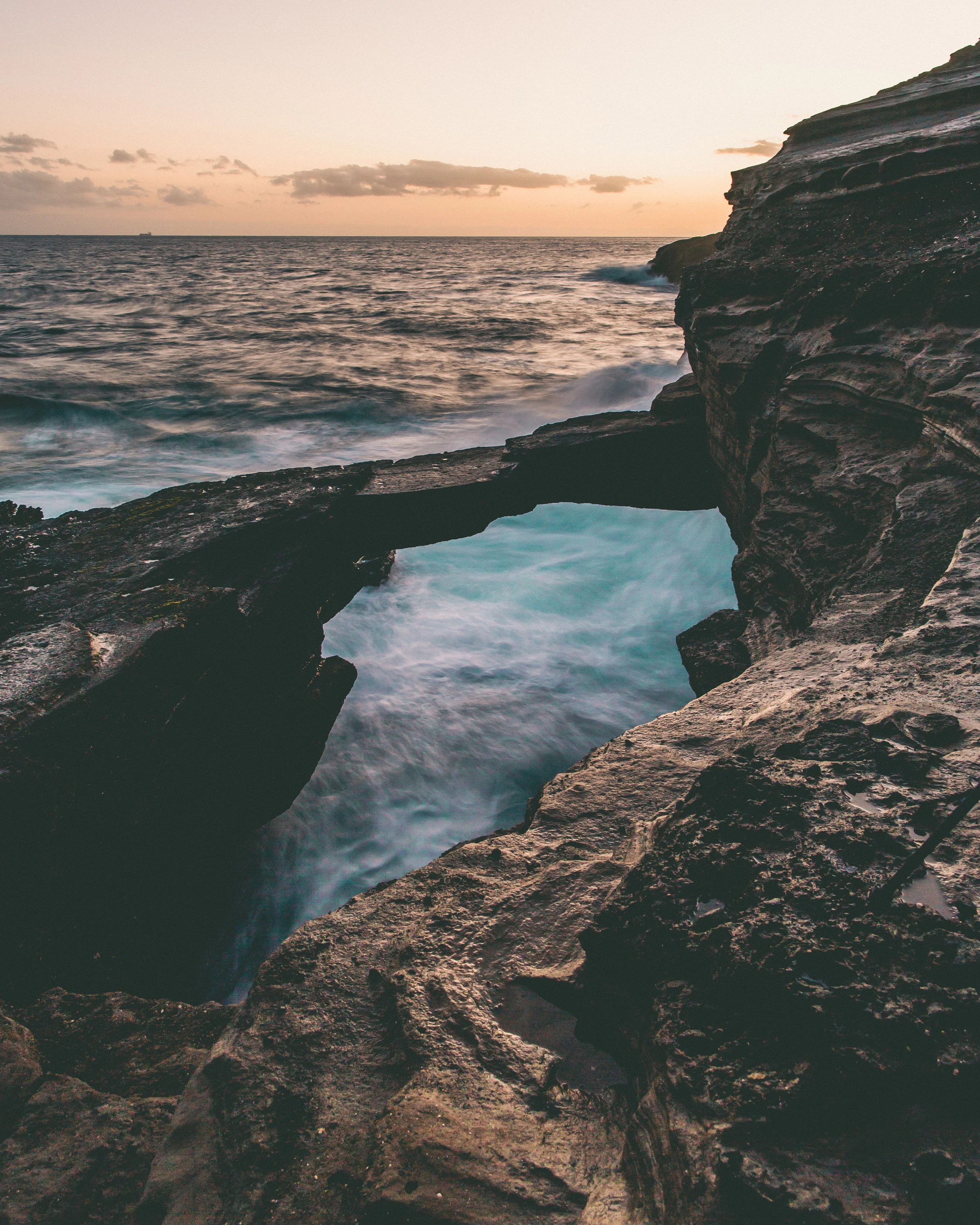Around 4:30pm, Mike suggested we hit Hanauma Bay State Park for sunset. An hour or so later we found the park gates closes at 6pm as we arrived at 5:55pm. We found a parking lot overlooking Koko Head across the road, parked and threw on our backpacks. We hiked half an hour uphill and then down some loose sediment layers to find the hidden rock bridge. Playing near where the waves meets the rocky shore is not for the faint of heart. We heard a few souls have been lost to the ocean here. At one point, a jet-skier came close to us and asked if we were okay. It was the first time I used the shaka gesture since setting foot on the island. :) Also, check out Mike's "getting-ready-to-dip-out" stance!