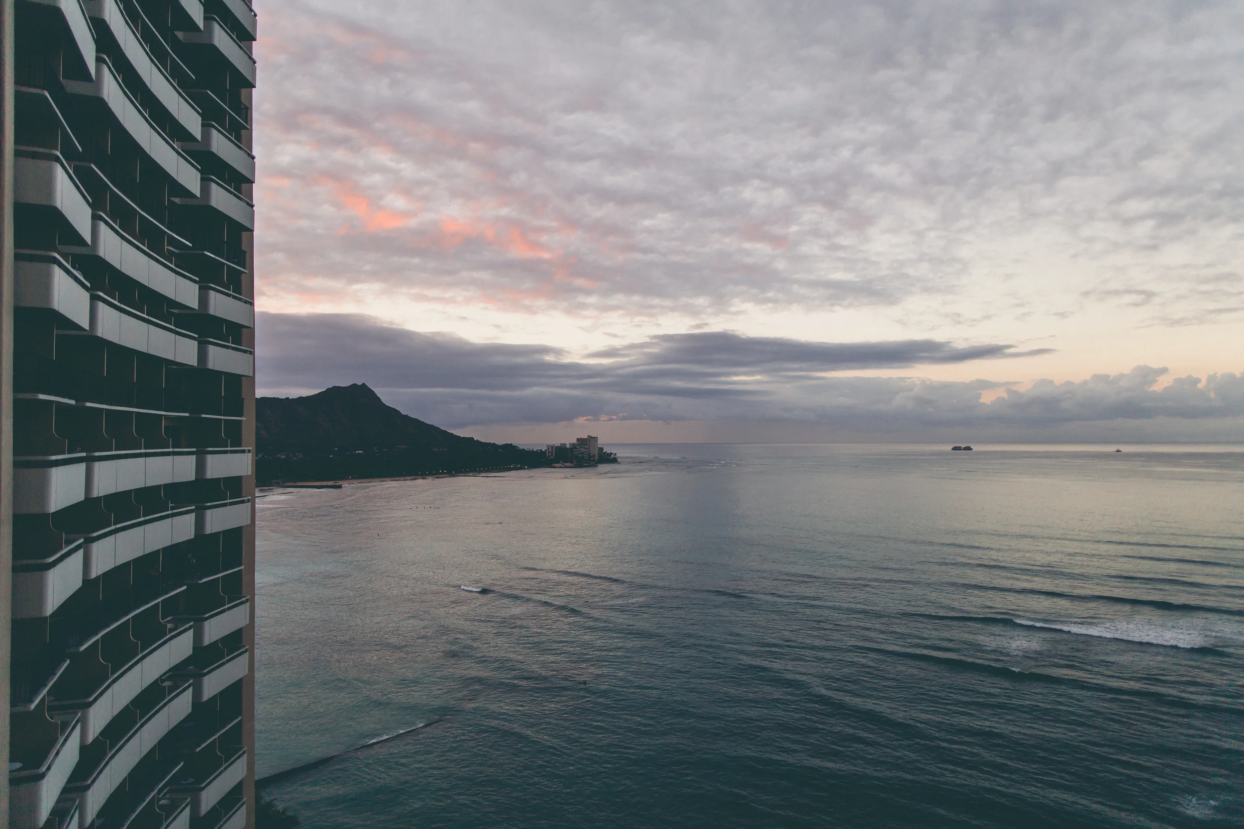 We woke up just as the sun was to begin peaking from behind Diamond Head. Mike was the smart guy as he went down to the beach below and did what he does best - shooting sunrise. Me? I was lazy and just sat out on the hotel patio. This being our third day on the island, I hadn't even felt the sand of ANY beach beneath my feet, let alone swim in the warm Pacific Ocean waters. One of my goals for this trip was to do one of the Triple-S's: swim, surf or snorkel. None of these things happened. The. Whole. Trip. Seriously, straight up fail. Anyhow, back to the 18th-floor patio with my coffee, cookies, and the view of the paddlers, paddling out to sea.