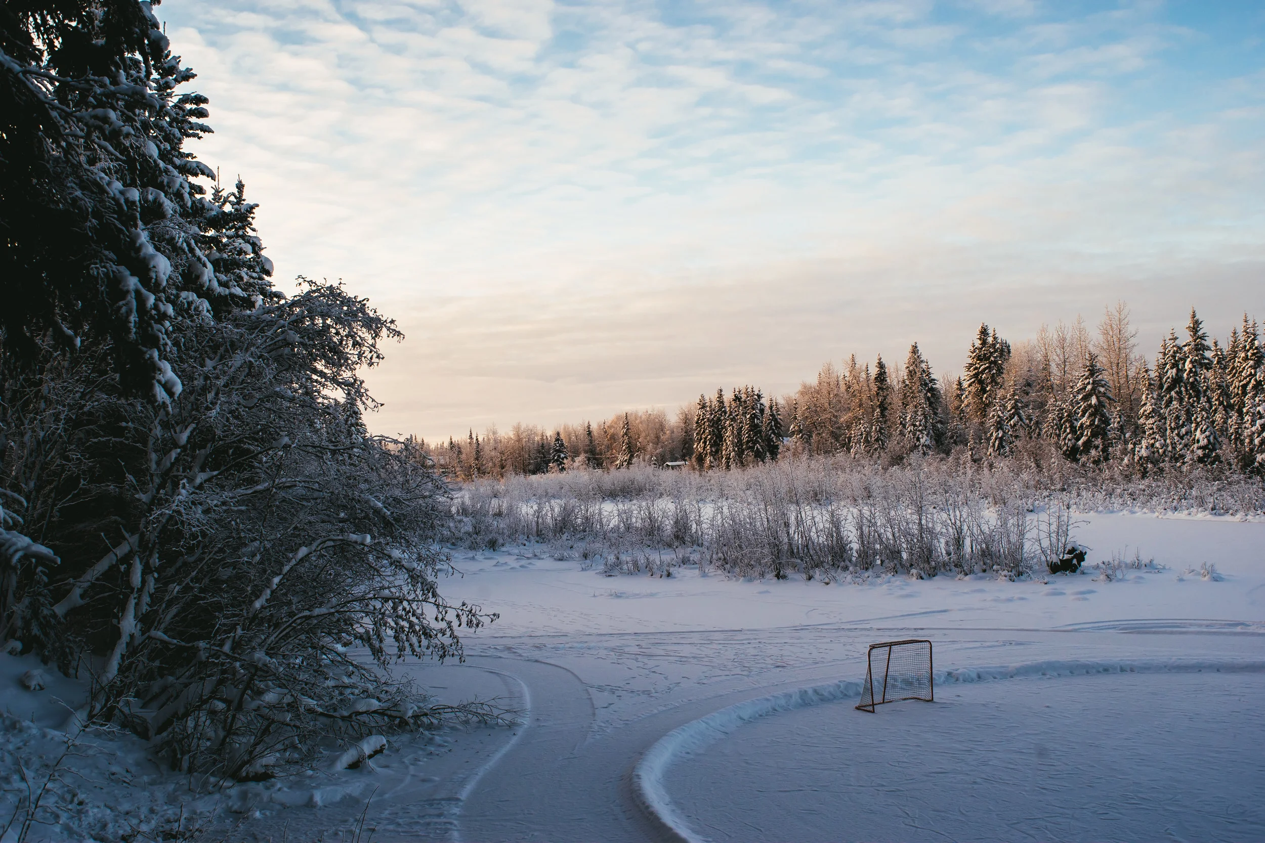 On the back patio, looking out over the frozen river. Rodney takes great care in keeping the hockey ring ready for a shoot out.