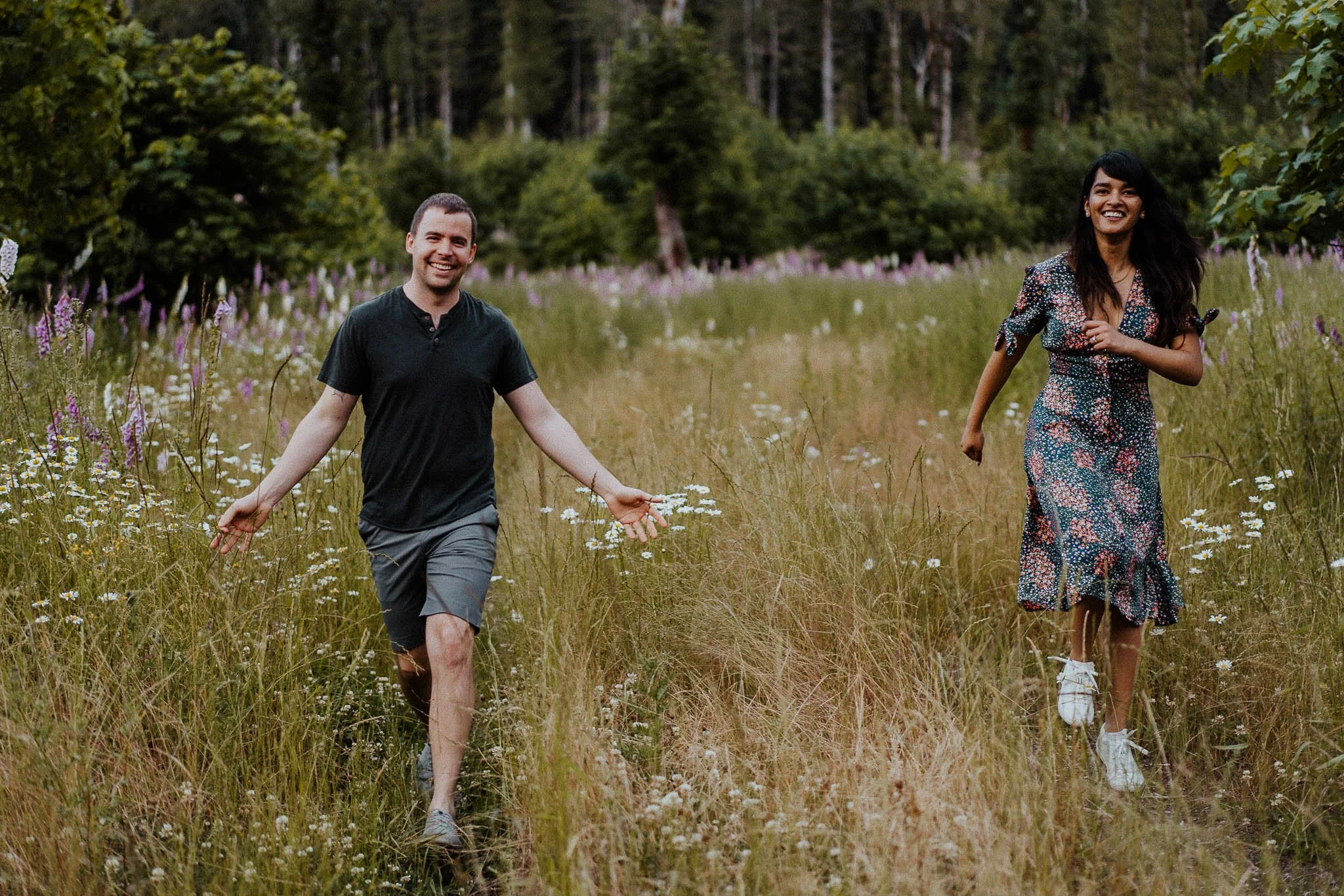 During our inquiry process - and much to our delight, we found that we were both California natives and now are living for the outdoors in the beautiful Pacific Northwest. So thus, making it easier to connect for our connection session in Mt Hood National Park. We started the day with a drive towards Old Salmon River trail in Welches, Oregon, but passed by a beautiful field of foxgloves flowers in bloom and had to make a quick stop. This is where I learned how intelligent Nick is with plant names and his love for biology. He even got distracted by a white moth that he gracefully captured into his hands. The moth hung out for a while, wished them a happy engagement shoot and went on its way -fluttering through the field.