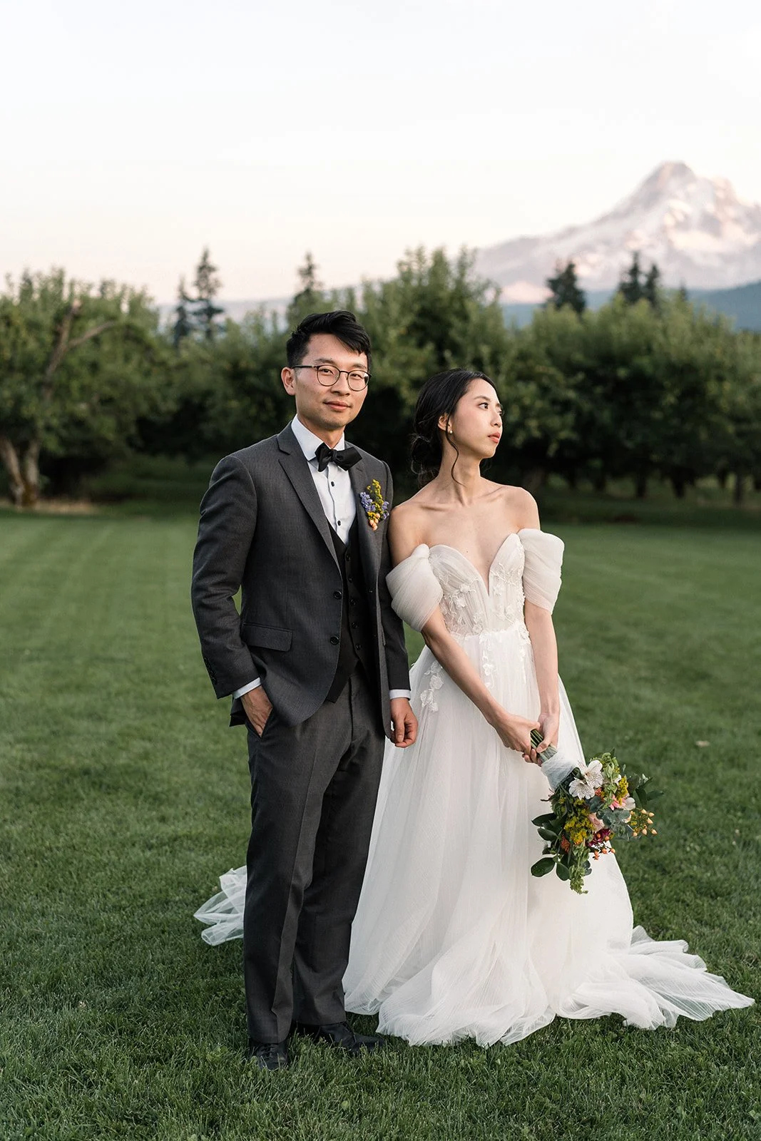 Bride and groom holding hands and walking on a lush green lawn with a backdrop of Mt Hood Mountain peak.